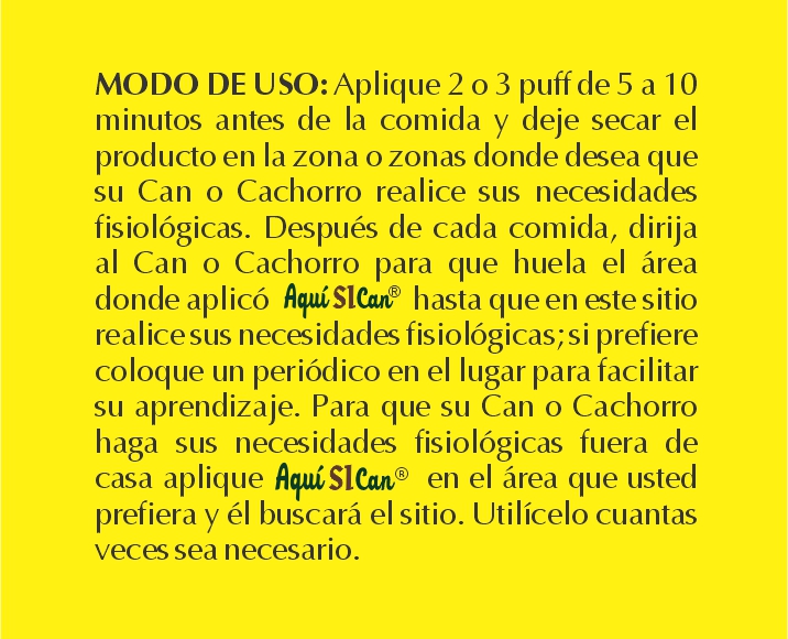 Para que su Can o Cachorro haga sus necesidades fisiológicas aplique aquí sí can en el área que usted prefiera y él buscará el sitio. Utilícelo cuantas veces sea necesario.