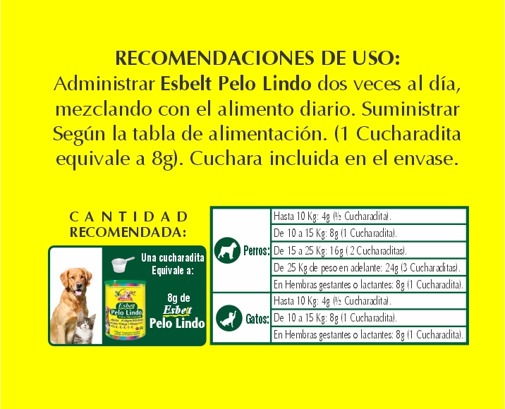 Producto natural para la salud y bienestar de tu perro: P & C Esbelt Pelo Lindo Micronizado, 300 g. Cuida a tu perro con la línea de productos Pets and Cats, diseñados para mejorar su salud, comportamiento y bienestar de forma natural. Piel y pelaje brillante, lindo, armonioso, sano y saludable.