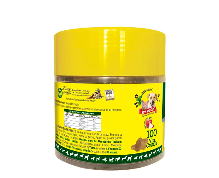 Producto natural para la salud y bienestar de tu perro: P & C Prodefens Probióticos, 100 Vitacrunch. Cuida a tu perro con la línea de productos Pets and Cats, diseñados para mejorar su salud, comportamiento y bienestar de forma natural. Activa el sistema inmune y fortalece las defensas.
